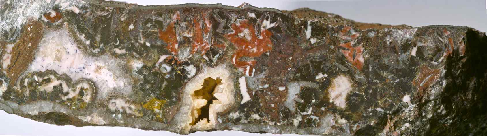 brekziierten Rhyolith (links), Seladonit und Calcit, Calcit und