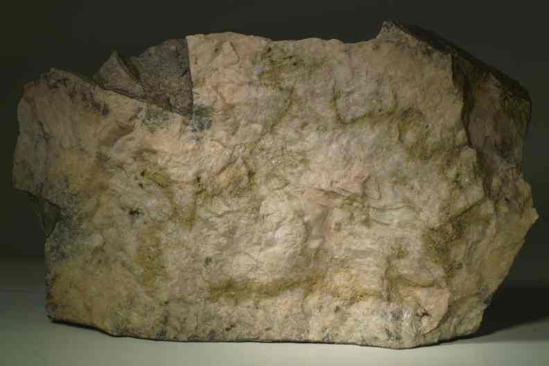 Im Bereich der Erzimprägnationen ist der Rhyolith verändert (alteriert). Insbesondere die Feldspäte - sichtbar erst auf der 3. Sohle - sind dort in gelblichen Seladonit (?) umgewandelt.